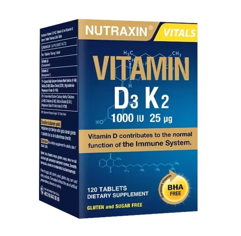 Nutraxin D3K2 tablet; kolekalsiferol formunda D vitamini ve Menakinon-7 formunda K2 vitamini içerir. Nutraxin D3K2 vitamini her tablette 1000 IU D3 vitamini ve 25 mcg K2 vitamini içermektedir.